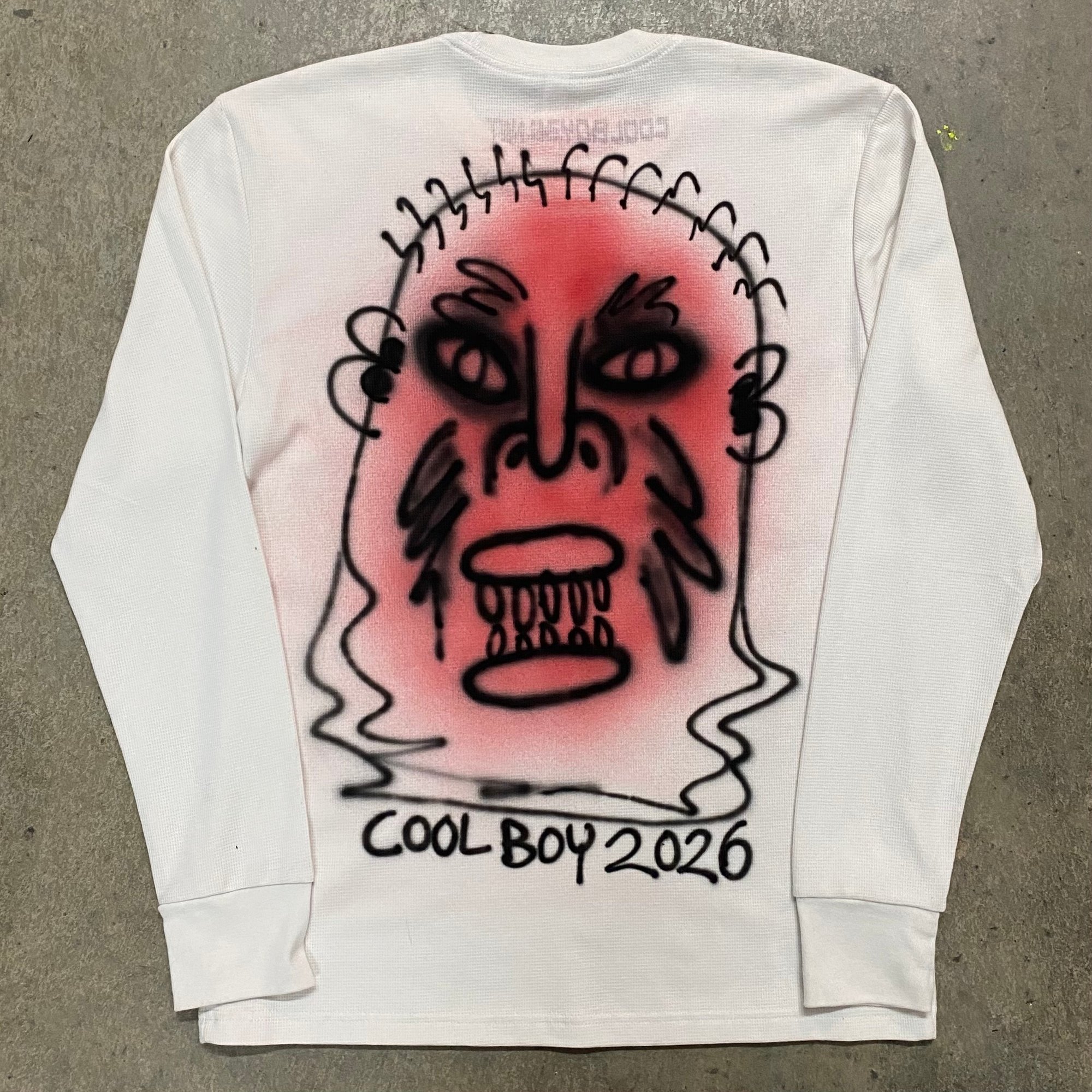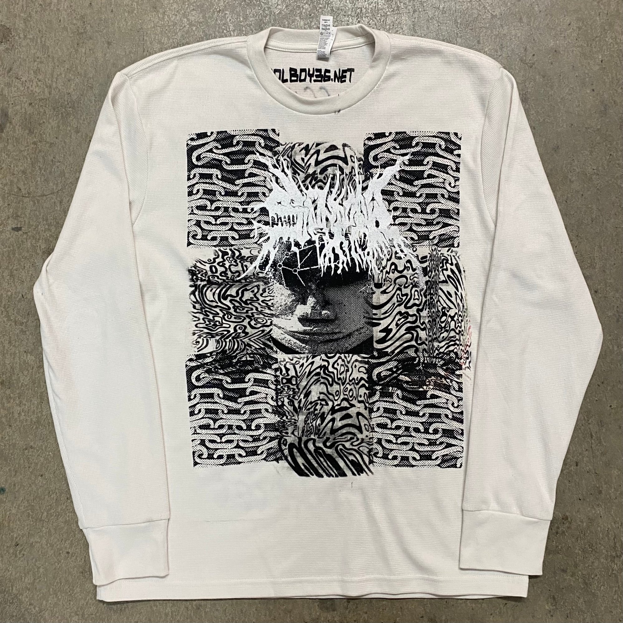 FEATURES "ANCIENT TABLET" MOTIF SCREENPRINTED ON FRONT AND "ZOMBIE" AIRBRUSHED GRAPHIC ON BACK. FRONT IS HAND PRINTED AND ARRANGED USING 4 DIFFERENT SCREENS WITH PLASTISOL INK. BACK IS 2 COLOR AIRBRUSH DESIGN. EACH ONE IS A LITTLE BIT DIFFERENT. LIMITED TO 15 PIECES.